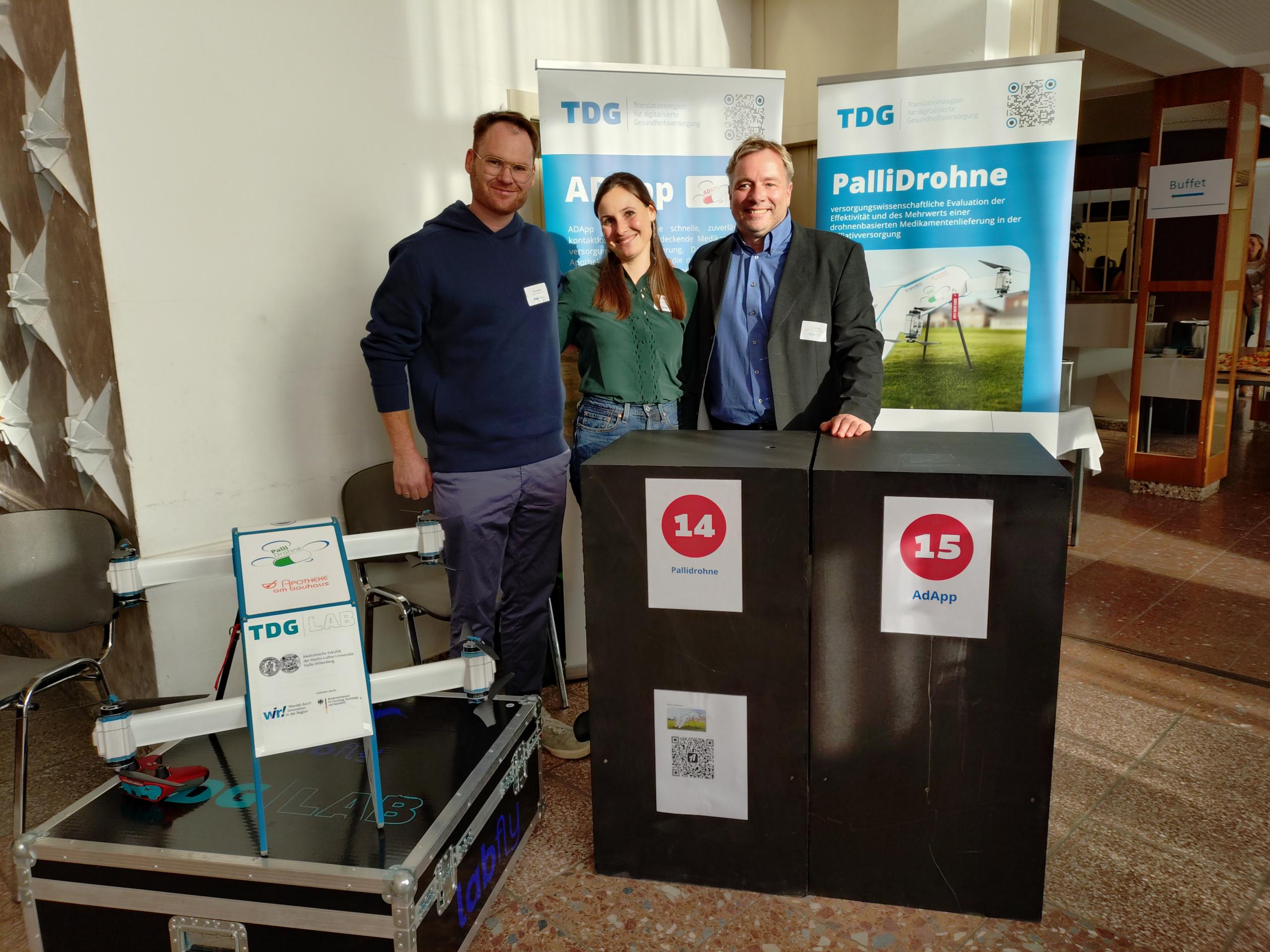 Am 17.11.2025 war unser PalliDrohne-Projektteam mit einem eigenen Stand auf dem TDG/TPG Innovation Summit in Teutschenthal vertreten. Die mittlerweile vierte Auflage dieses Pflegekongresses führte insgesamt rund 350 Fach- und Führungskräfte, Wissenschaftler:innen, Entwickler:innen sowie Pflegende und Betroffene aus ganz Mitteldeutschland zusammen. So hatten wir neben der Präsentation unseres Projektes im Rahmen der Innovationsmesse auch die Gelegenheit, uns mit Teilnehmenden und Besuchern über die aktuellen Perspektiven des Projektes – insbesondere auch im Hinblick auf eine wirtschaftliche Verwertung – auszutauschen und uns einen Überblick über weitere technologische Innovationen zu verschaffen. Unser Fazit: Der TDG/TPG Innovation Summit 2025 war für uns weit mehr als eine Bühne – er war ein Katalysator.
